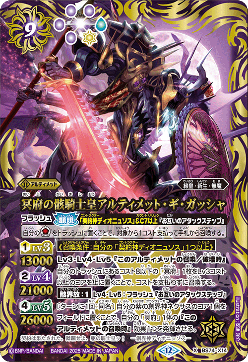 オリン方面,令人懷念的「創界神ディオニュソス」以「冥府の契約神ディオニュソス」之姿復活!這是能活用將自己所有「冥府」的Lv費用-1的強力【契約域】作戰的牌組。身為締皇究極卡的「冥府の骸騎士皇アルティメット・ギ・ガッシャ」具備在召喚/破壊時,可透過在廢棄區的費用8以下的「冥府」上放置Lv3費用以上的能量,無需支付費用即可召喚的強力效果,且在Lv4・5時可透過【骸界放】發揮自己1體「冥府」的「召喚此究極卡時」效果1次,能一舉完成場面布局。而AX稀有的「究極冥府龍アルティメット・ムゲンドラゴン」在召喚/攻擊時可透過【WC觸發】,根據命中次數將對手場地的任意數量的3個能量移至空間,雙重命中時更將該回合所有費用6以上的己方究極卡標誌固定為3個紫色標誌。請以大量展開三重標誌攻擊及因應局勢的靈動效果計劃奪取勝利!