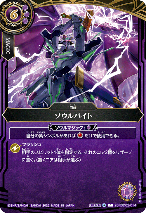 整盒購買特典中,將能搶先獲得4月啟動的新對戰模式「Standard」的卡牌!這6種卡牌,全都是於「Standard」登場的靈魂魔法卡,並且使用了Battle Spirits歷代人氣靈魂卡的新版插圖設計。這些都是在「Standard」中必定活躍的強力卡牌,期盼各位能入手這些卡牌,一同等待「Standard」的啟動!