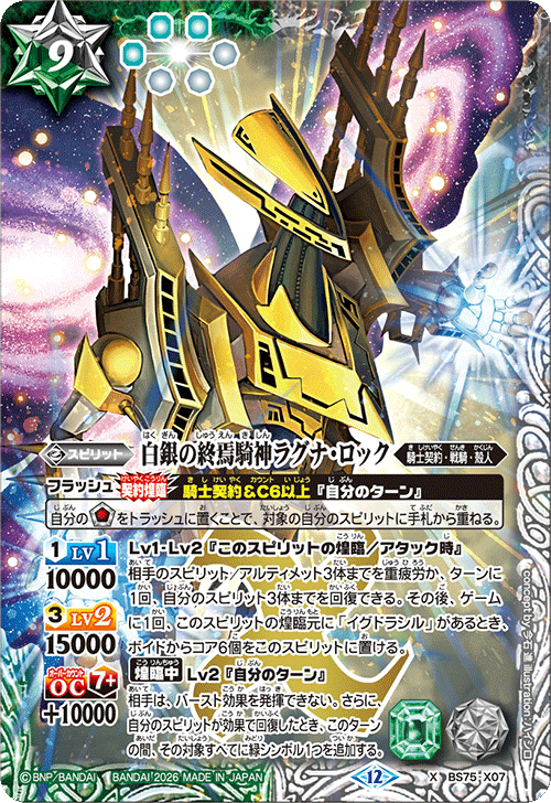 「白銀の鉄騎皇イグドラシル」可以疲勞己方1個「白銀」,並以此效果使1體需求在此疲勞對象以下的對手靈魂卡/究極卡返回牌組下方。此外,它擁有【騎装甲:赤/白/黃】能力,己方所有「白銀」靈魂卡皆不會受到對手赤/白/黃色效果的影響,並且能以疲勞狀態進行防禦。「白銀の翼神機グラン・ウォーデン」在手牌時,若對手在瞬間時機使用了魔法卡,可以在其效果發動前視為已將靈魂能量置於棄牌區而進行《契約煌臨》,並在此時無效化該魔法卡的效果,這是「グラン・ウォーデン」的招牌能力。關鍵卡牌「白銀の終焉騎神ラグナ・ロック」在煌臨/攻擊時,可以使對手最多3體靈魂卡/究極卡重疲勞,或是每回合1次,恢復己方最多3體靈魂卡,並且在遊戲中1次,當煌臨源為「イグドラシル」時,可以從空間將6個能量放置於自身。再者,煌臨中的己方回合,對手將無法發動爆裂效果,且當己方靈魂卡因效果而恢復時,該回合中,能為所有恢復對象各追加1個綠標誌。讓我們以擁有抗性的複數標誌靈魂卡進行連續攻擊來贏得勝利吧!