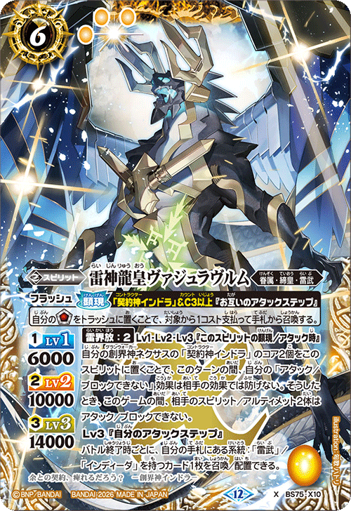 インディーダ的契約神「天雷の契約神インドラ」,與新系統:「雷武」相性絕佳,是一個活用其能在整場遊戲中讓對手1體靈魂卡/究極卡無法攻擊/防禦的強力【契約技】來戰鬥的牌組。作為締皇靈魂卡的「雷神龍皇ヴァジュラヴルム」擁有【雷界放】,在顕現/攻擊時將「契約神インドラ」的2個能量放置於自身後,該回合中,對手將無法以防禦效果阻止己方賦予的「無法攻擊/防禦」效果,並且在此時能進一步讓對手2體靈魂卡/究極卡無法攻擊/防禦。接著,AX稀有度的「超龍雷神グラン・サジット・ノヴァ」,在煌臨/攻擊時若為己方的攻擊階段,則能發揮生命值燃燒效果,針對每1體處於「無法攻擊/防禦」狀態的對手靈魂卡/究極卡,都能將對手生命值區的1個能量移至預備區。讓我們運用「契約神インドラ」與「雷神龍皇ヴァジュラヴルム」封鎖對手攻擊/防禦的同時,再以「超龍雷神グラン・サジット・ノヴァ」的生命值燃燒與雙重標誌攻擊,一決勝負吧!